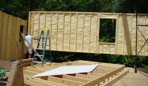 A panelized home wall being placed. Note this is an open wall system with insulation already sprayed.